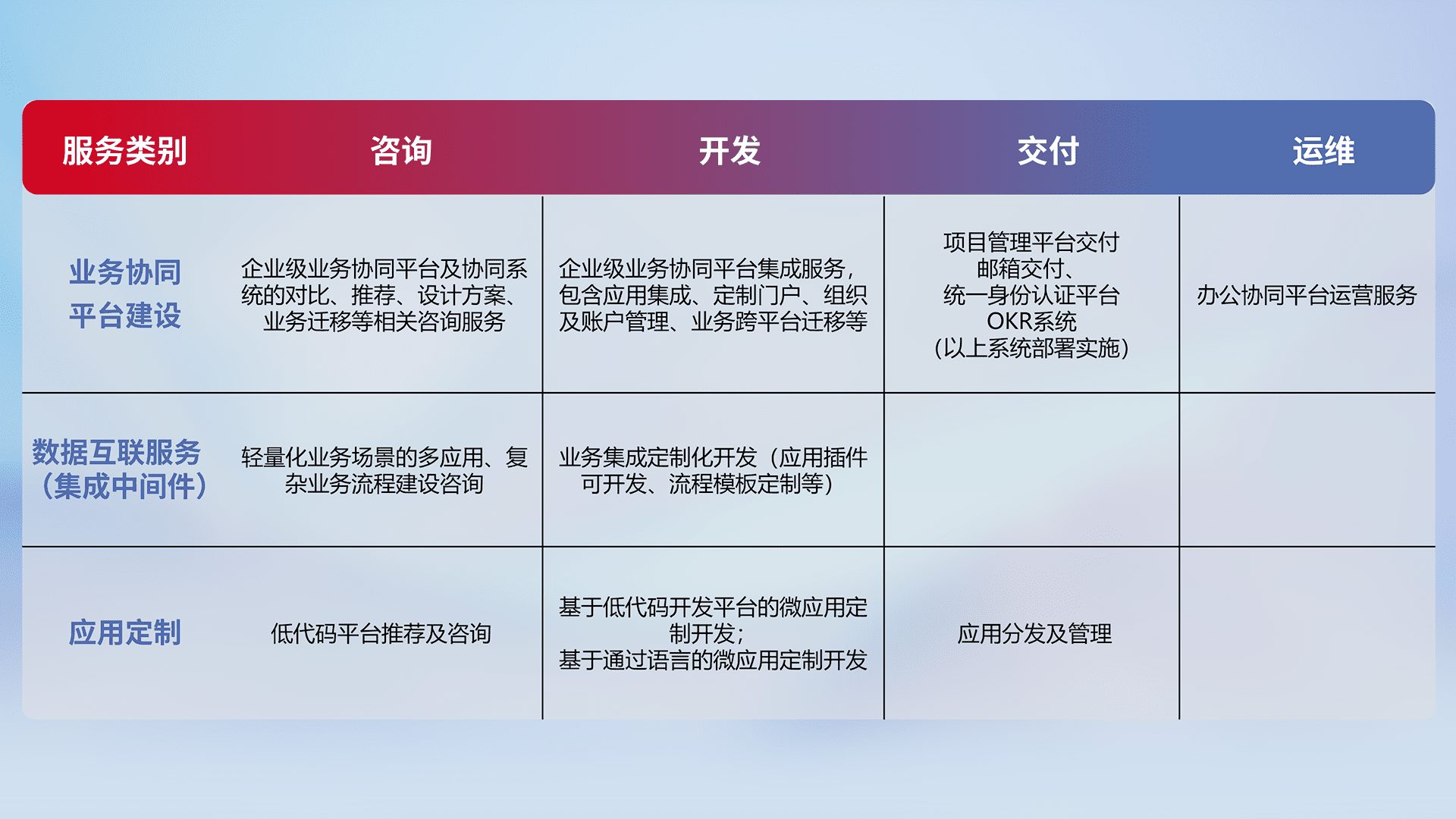 针对钉钉、、、企微、、、、IDaas等平台级产品提供产品的规划、、、、方案、、、交付、、、、定制化开发等服务,,,,实现如统一协同办公、、、、智能客户服务、、、混合会议管理、、、、智能数据查询、、、等业务场景,,,实现数字化转型。。